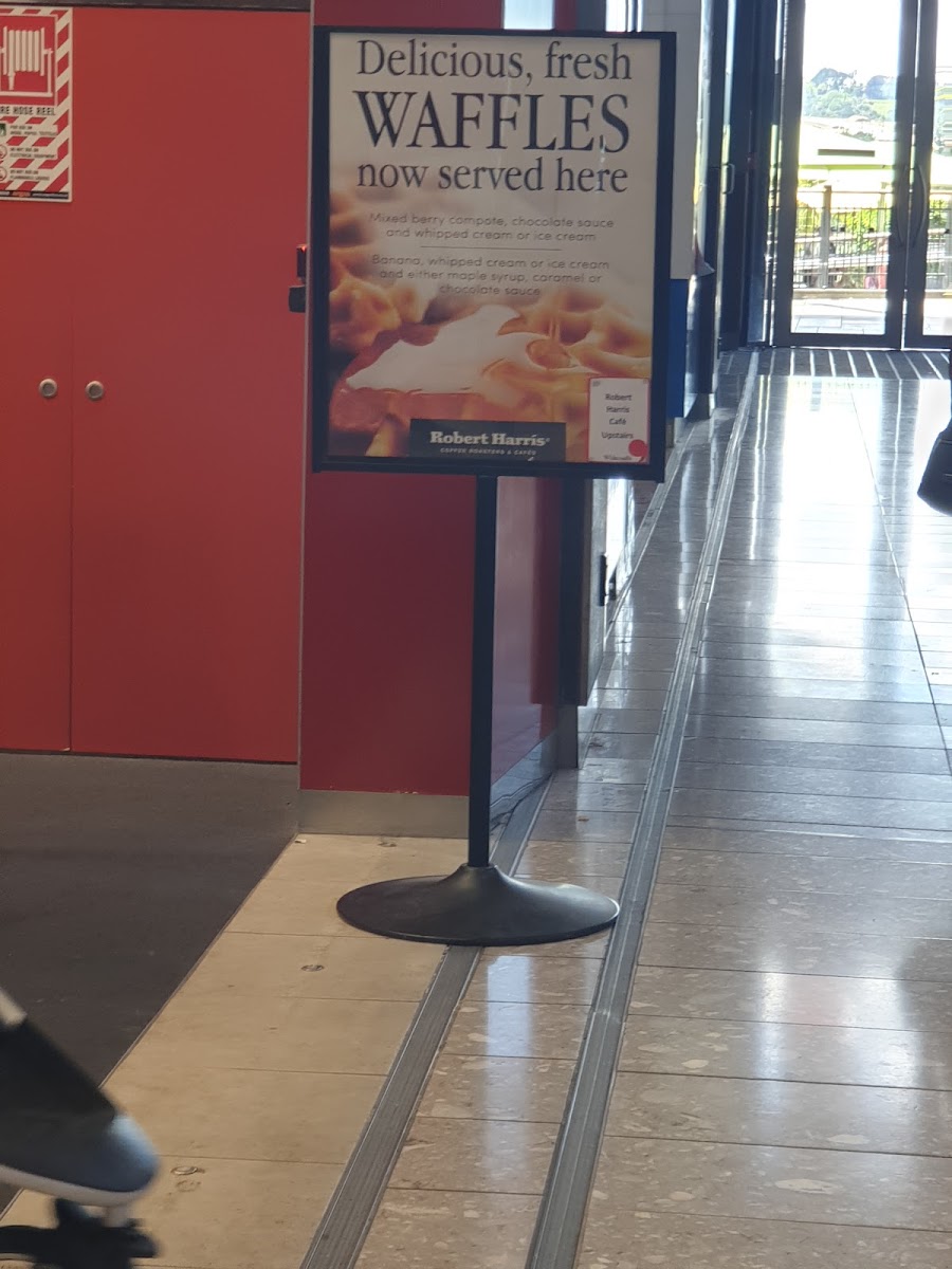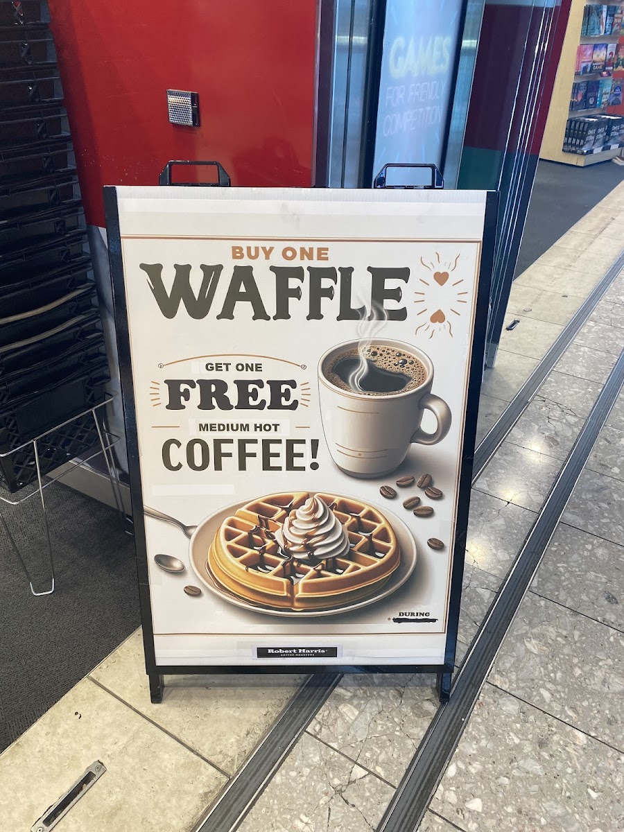 Food offerings primarily include freshly made waffles served with coffee, as well as other light treats like cakes. The menu accommodates those seeking a quick order or a relaxed light meal.